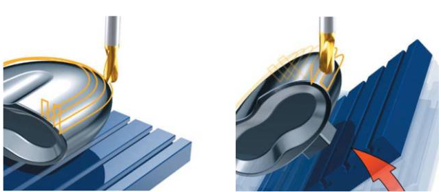 如上图,在左图中三轴切削方式,当切削刀具向顶端或工件边缘移动时,切削状态逐渐变差。而要在此处也保持最佳切削状态,就需要旋转工作台。而如果我们要完整加工一个不规则平面,就必须将工作台以不同方向旋转多次。可以看见,五轴机床还可以避免球头铣刀中心点线速度为0的情况,获得更好的表面质量。