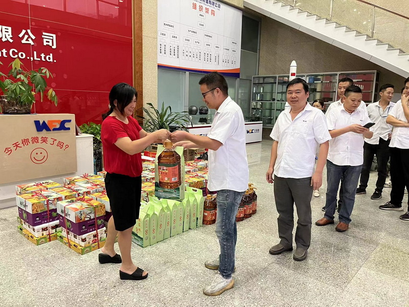 董事长何女士亲手为职工们派发福利。一部分人先富起来,然后带动更多的员工,老乡,供应商,合作伙伴等共同富裕,是何董事长和领导层集体的心愿。